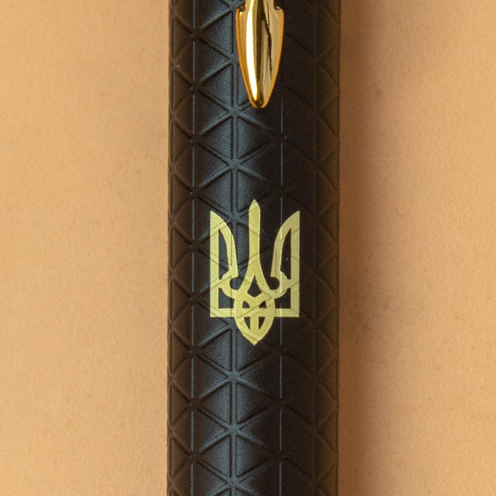 Шариковая ручка Parker IM Premium Black GT BP с гравировкой Герба Украины (Трезубец). Премиальная модель в черном матовом дизайне с резным узором. Высококлассная ручка с гордым украинским духом для ежедневного письма и особых моментов.