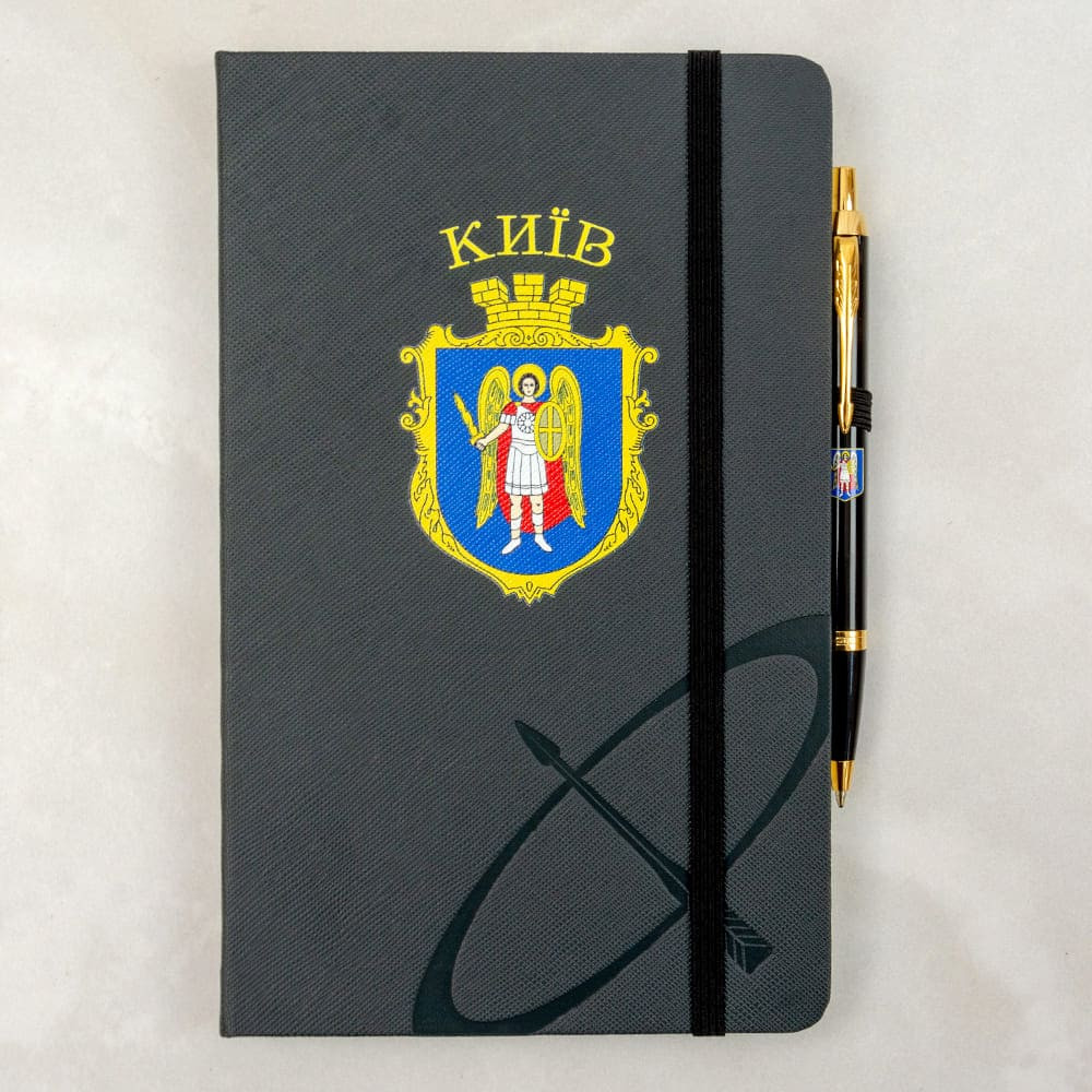 Серый твердый переплет с тисненым логотипом Parker и напечатанным Гербом Киева.