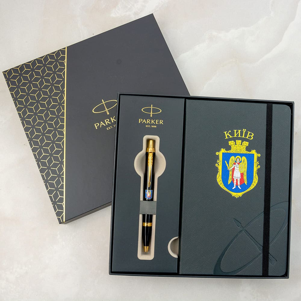 Эксклюзивный подарочный набор Parker: шариковая ручка IM CITY Black GT и записная книжка, украшенные качественной цветной печатью с геральдическим символом столицы Украины города Киева (Архангел Михаил на синем щите). Специальное предложение, которое станет настоящей находкой, если вам приходится часто принимать гостей или делегации из других городов или стран. Серия IM предлагает ручки с элегантным силуэтом и безупречным профессионализмом, дизайн и размер которых идеально подходит для мужчин и женщин. Ручка Parker IM – идеальное соотношение практичности и стиля.