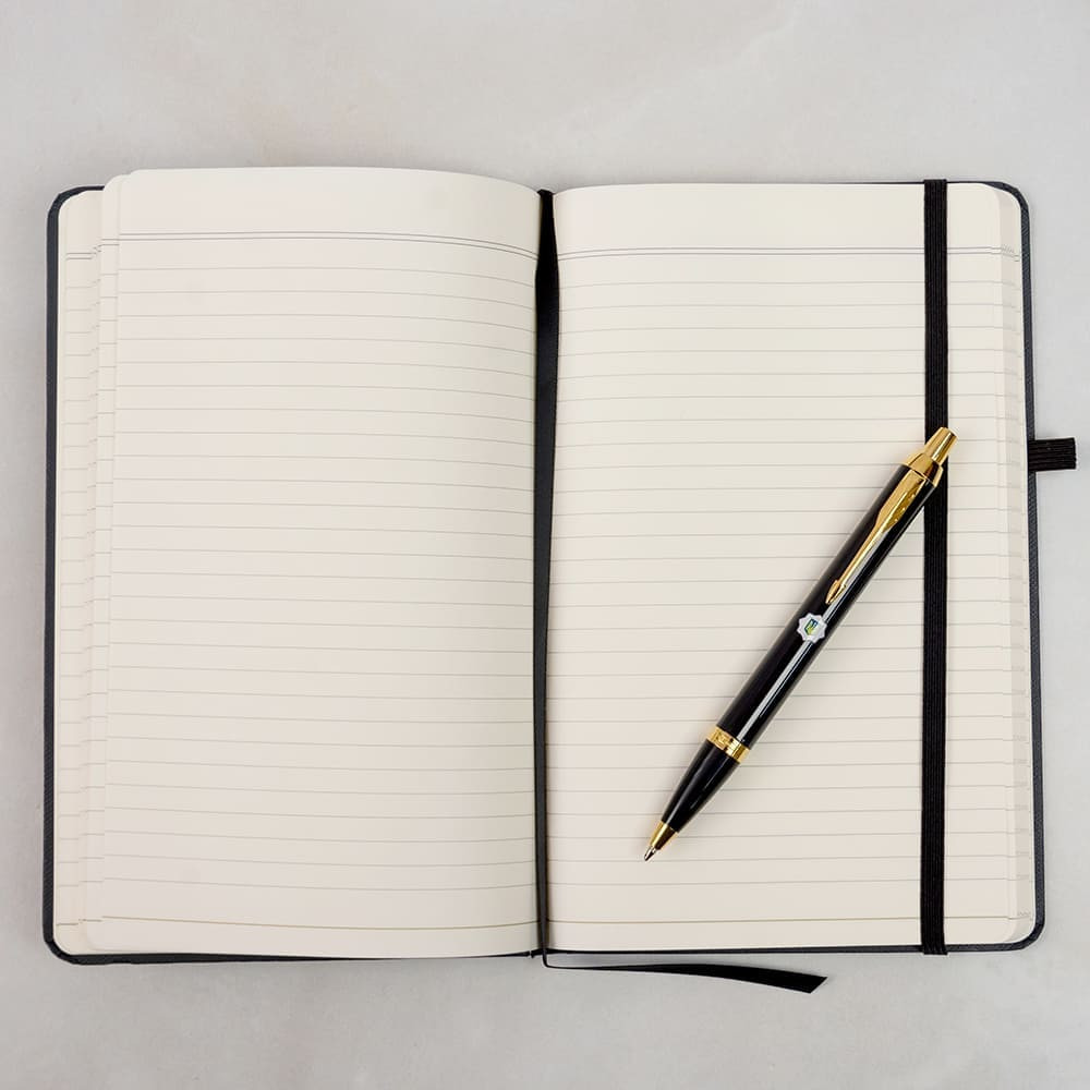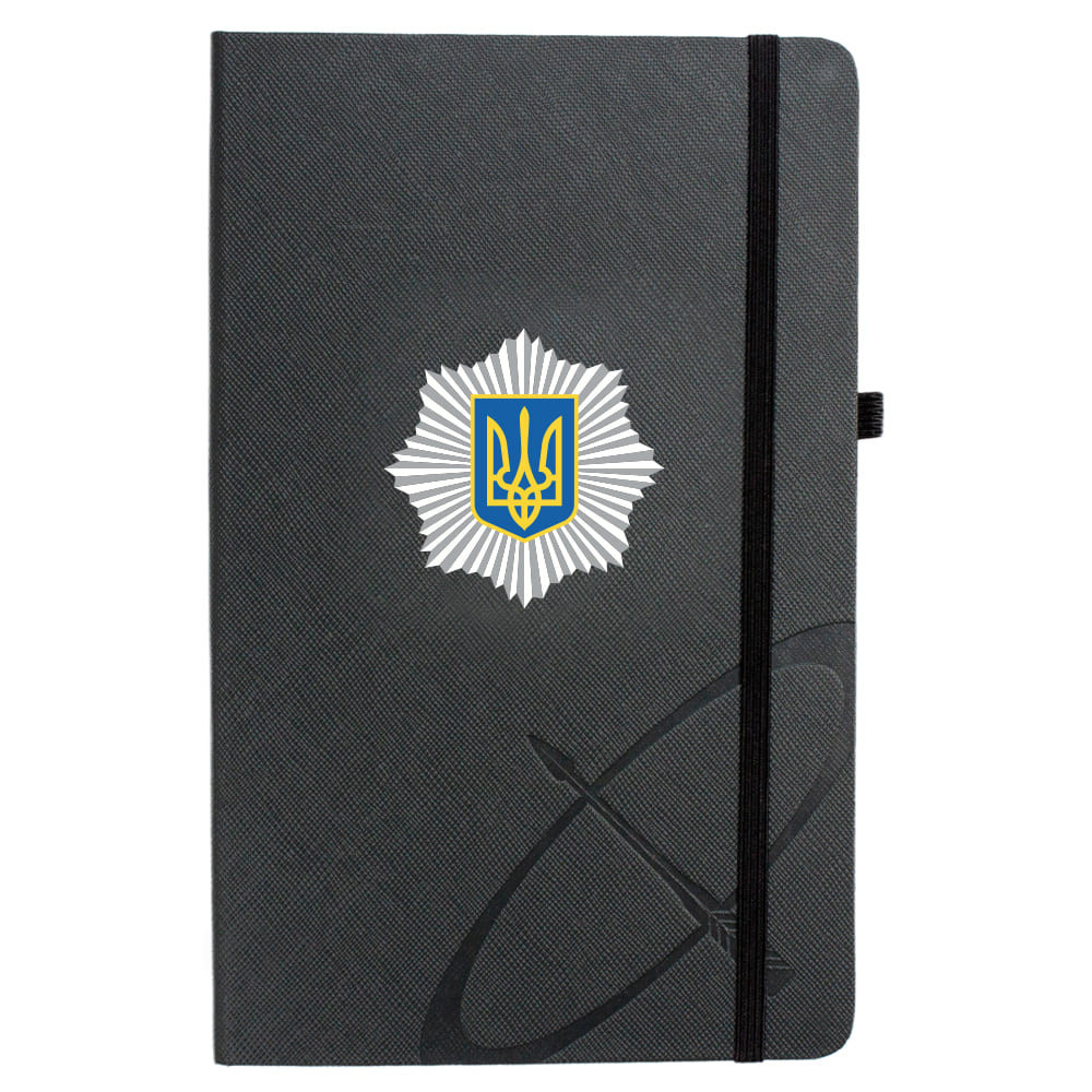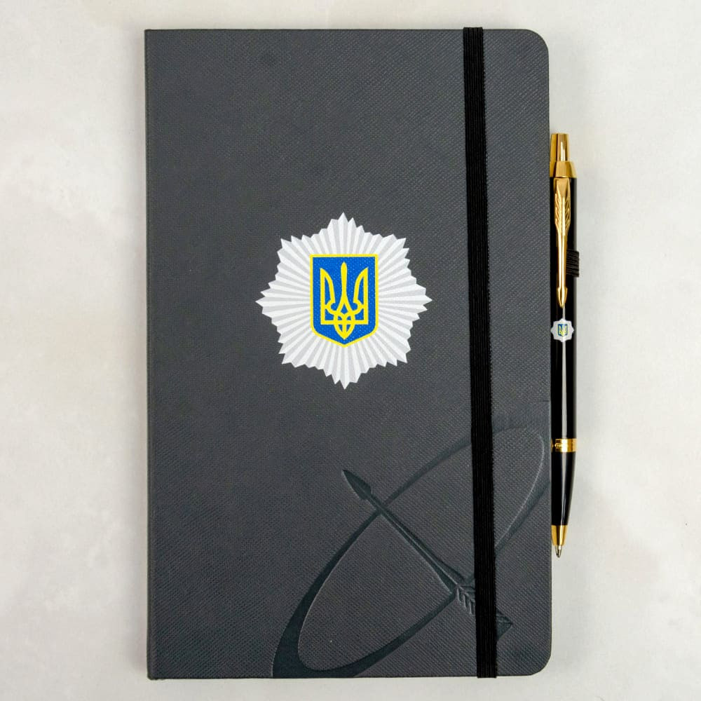 Серый твердый переплет с тисненым логотипом Parker и напечатанной Эмблемой МВД Украины.