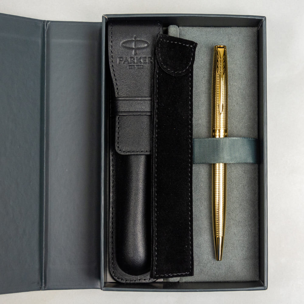 Набор Parker с шариковой ручкой SONNET SE Ciselé Gold GT с золотым покрытием в уникальной комплектации, дополненной кожаным и бархатистым чехлом в подарочной коробке.