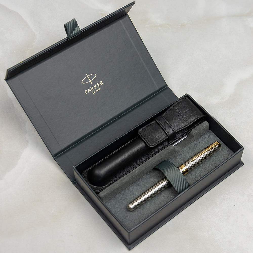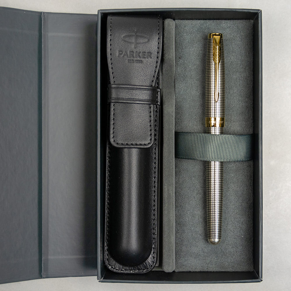 Подарочный набор Parker с серебряной перьевой ручкой SONNET Cisele Silver GT с золотым пером 18К в специальной комплектации, дополненной кожаным чехлом и подарочной коробкой.