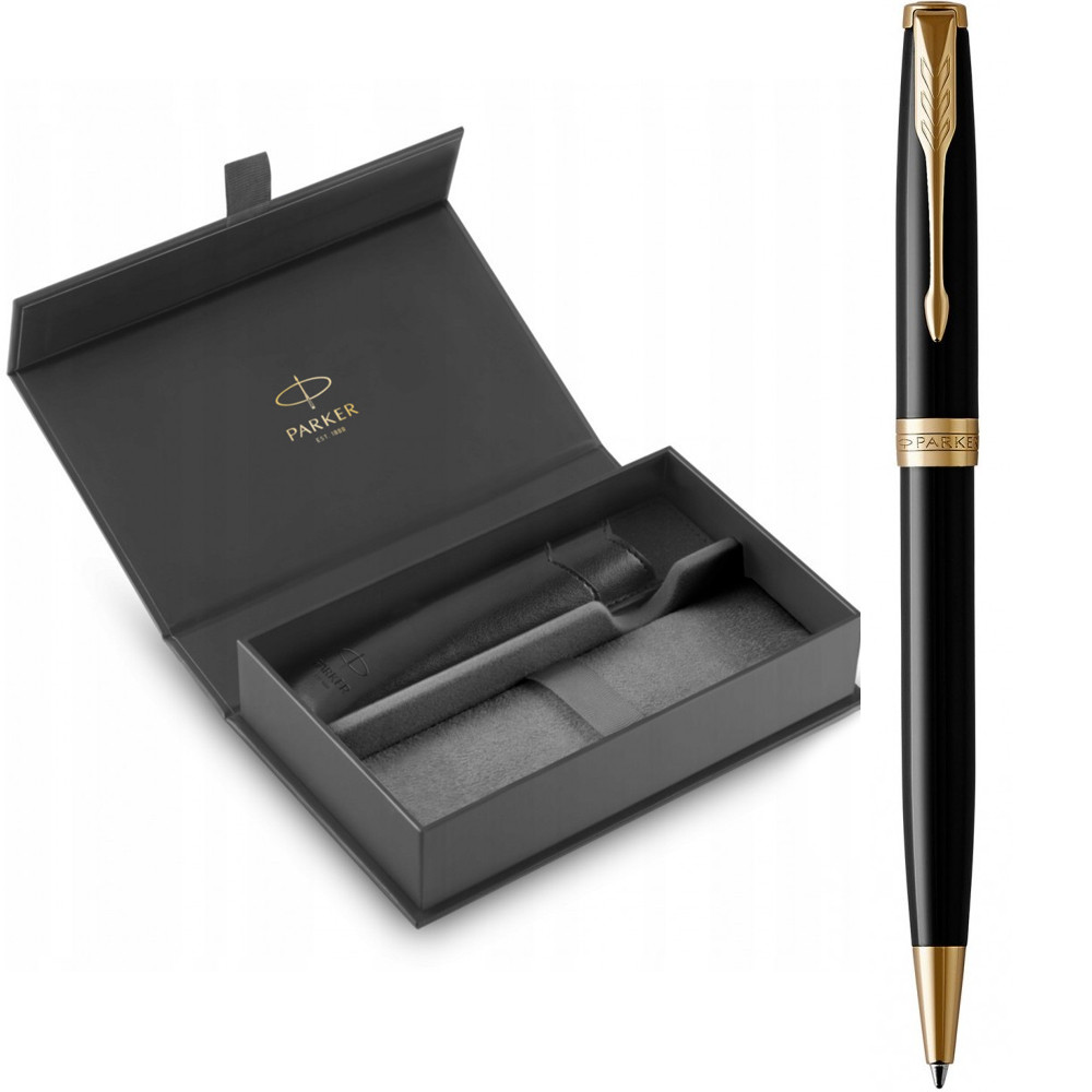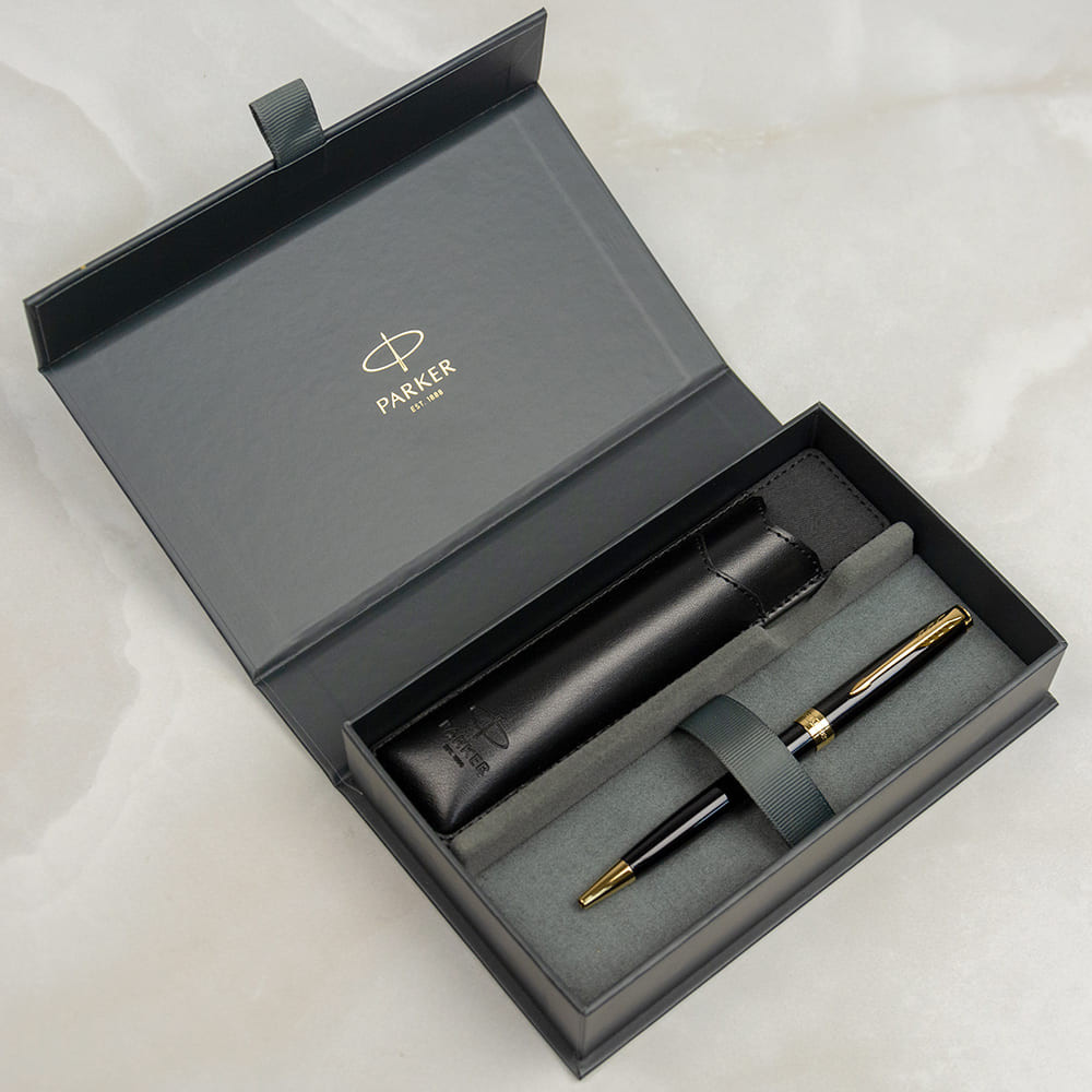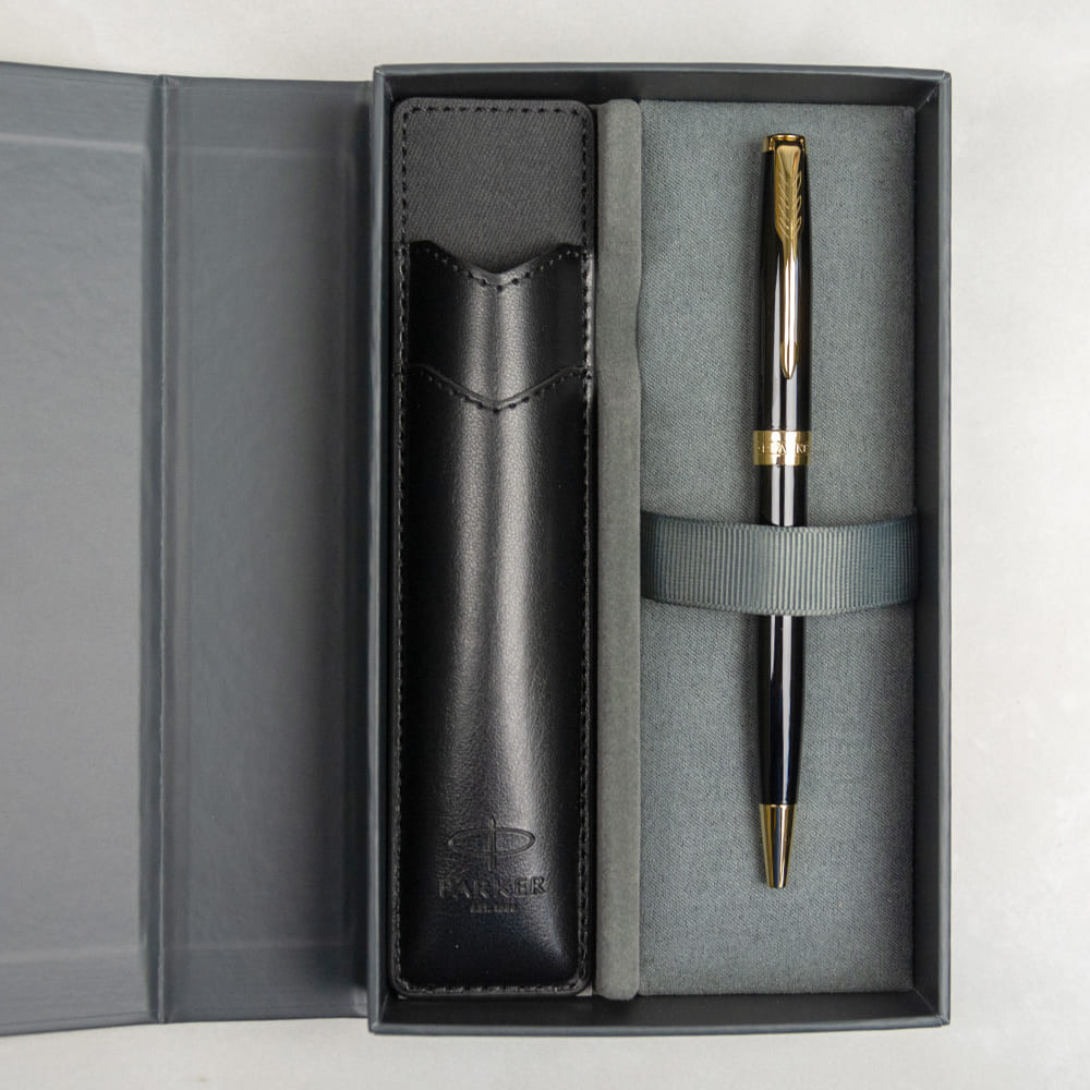 Классический набор Parker: шариковая ручка SONNET Black Lacquer GT в уникальной комплектации с черным чехлом в подарочной коробке.