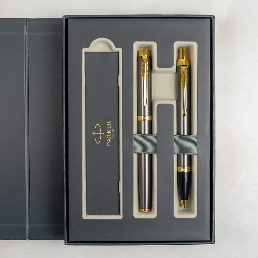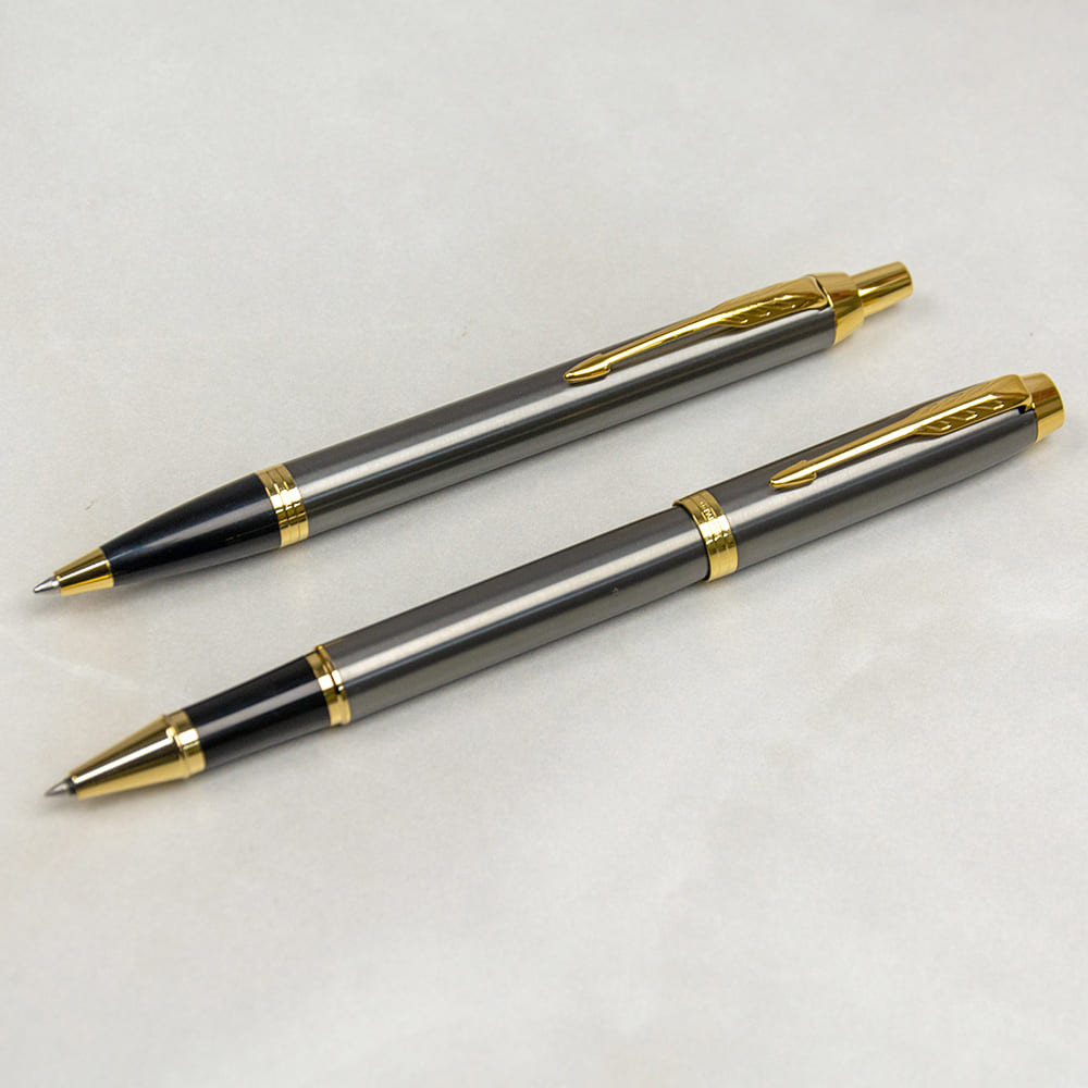 Набор ручек Parker IM Grey Lacquer GT RB+BP DUO24: роллерная и шариковая ручка в подарочной коробке на две ручке. Обе ручки представлены в отделке IM Grey Lacquer GT в роскошном серо-золотом сочетании. Новый фирменный дизайн Parker, который представляет суть элегантности и сдержанности бренда. Ручка-роллер позволит вам наслаждаться идеально сбалансированным и плавным письмом, которое предлагает комфорт использование шариковой ручки и изысканный чернильный след, напоминающий перьевую ручку. В шариковой ручке использован оригинальный стержень, а запаса чернил хватит на линию примерно 3,5 км.