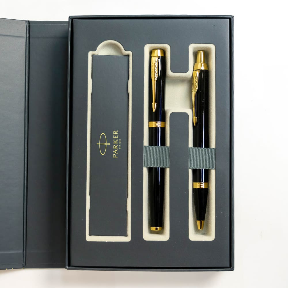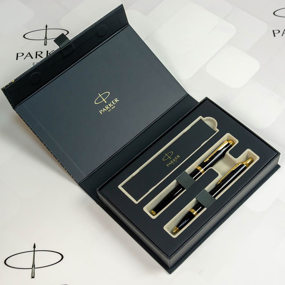 Подарунковий набір ручок Parker IM Black GT RB+BP DUO24. Комплектація із ролерної та кулькової ручки з однієї колекції – ідеальний вибір для ділової людини. Ролерна ручка чудово впорається з роллю вишуканого письмового інструмента для підписання важливих договорів, а кулькова ручка стане більш повсякденним варіантом.