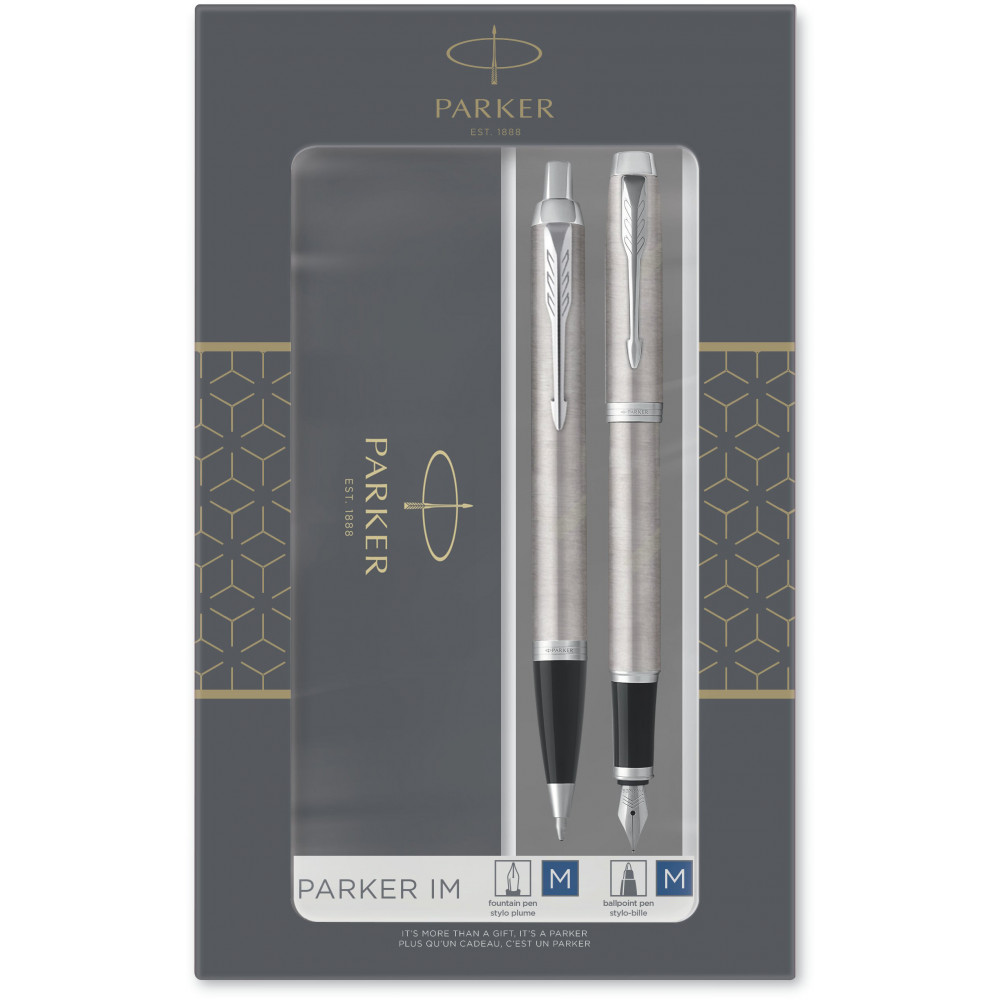 Подарунковий набір Parker з двох ручок (перова та кулькова) в оздобленні IM Stainless Steel CT. Ідеальний вибір для ділової людини. Перова ручка – це один із символів елегантності та поваги до мистецтва письма, тоді як кулькова ручка стане більш повсякденним варіантом.