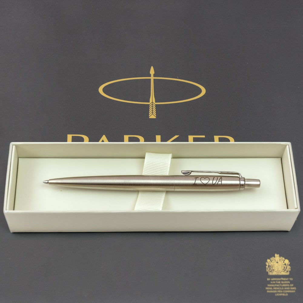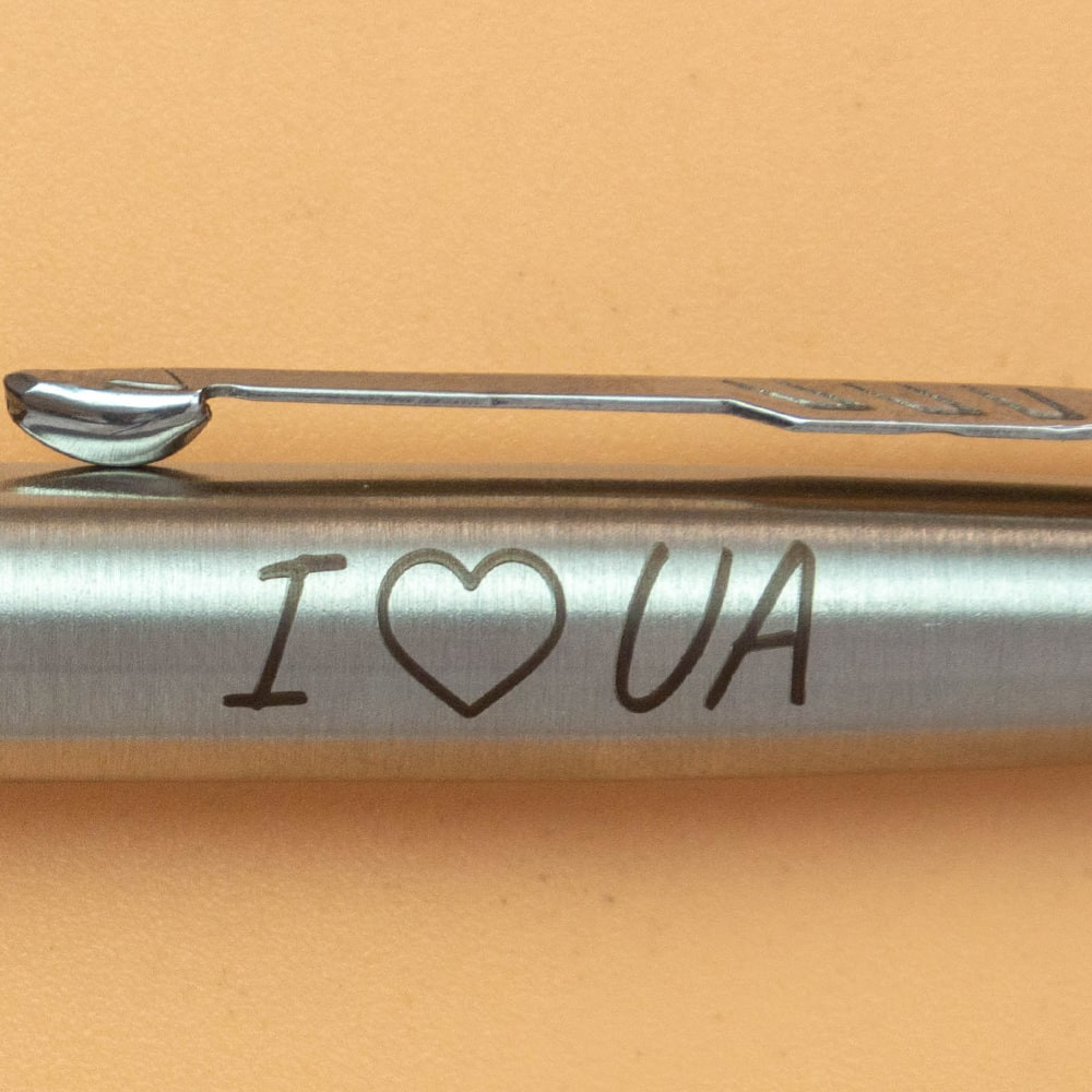 Кулькова ручка Parker JOTTER Stainless Steel CT BP з вигравіруваною біля затискача фразою I Love UA. Сталева ручка зі сталевим духом. Прекрасний подарунок для тих, хто пишається бути українцем.