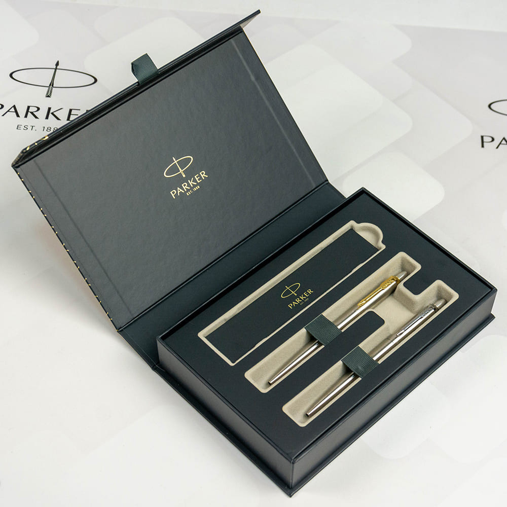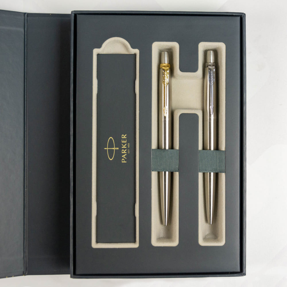 Parker JOTTER Stainless Steel GT BP+JOTTER Stainless Steel CT BP DUO24 – подарунковий набір із двох кулькових ручок у сталевому дизайні з оздобленням позолотою та хромуванням. Обидві ручки представлені в колекції Jotter, яка є справжньою іконою дизайну з 1954 року. Ідеальна ручка для щоденного письма та всіх, хто багато і часто пише: від учнів до професіоналів. Набір стане пам’ятним подарунком з будь-якої нагоди: успіхи в навчанні або роботі, на Різдво, Новий рік або День народження.