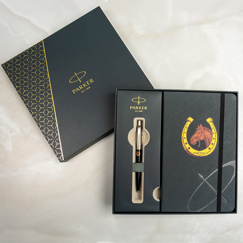 Подарунковий набір Parker в ексклюзивній комплектації: кулькова ручка JOTTER Originals ZODIAC Black CT та фірмовий блокнот, персоналізовані друком Коня з підковою. Згідно зі східним календарем, покровителем 2026-го року буде Кінь, який символізує родючість і силу, свободу і вірність, фізичну силу та мужність. Дизайн доповнено також підковою – символом удачі.