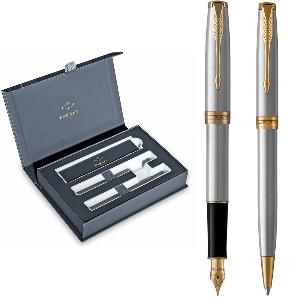 Parker SONNET Stainless Steel GT FP+BP DUO24 – подарунковий набір з перової та кулькової ручки у сталевому дизайні з високопробним золотим оздобленням. Колекція пропонує письмові інструменти з люксового сегменту. Перова ручка – це один із символів елегантності та поваги до мистецтва письма, тоді як кулькова ручка стане більш повсякденним варіантом.