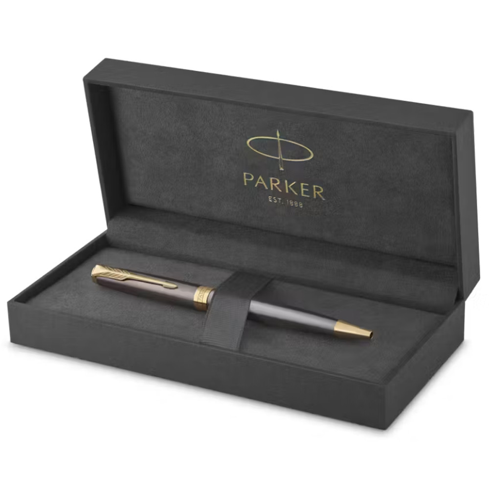 Кулькова ручка Parker SONNET Grey Lacquer GT 2213679 в розкішному сіро-золотому оздобленні. Складна деталізація та золоте PVD-покриття поєднуються з ковпачком та корпусом з неіржавної сталі, красиво оздобленим класичним сірим лаком. Новий фірмовий дизайн, який представляє суть елегантності та стриманості Parker. Елегантний профіль Parker Sonnet приємно тримати в руці жінці та чоловікові. Sonnet – вічний символ елегантності.